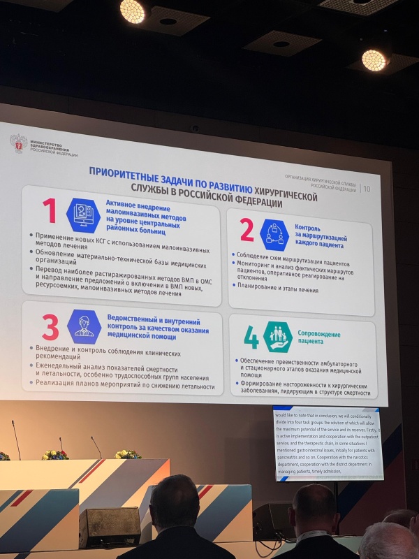 XVI Съезд хирургов России совместно с X Конгрессом московских хирургов прошел в Москве 21-23 октября. Он объединил более 4 тысяч участников из 80 регионов России и пяти зарубежных стран. В работе съезда было 53 научные секции, заслушано 366 докладов. В рамках уникального формата «живой хирургии» было реализовано 6 роботических операций, которые посетили 32 специалиста, и проведено 5 практических курсов. для 137 хирургов. На базе Московской школы хирургии прошло 9 активностей, включая 2 конкурса молодых хирургов и 4 мастер-класса. Организованы экскурсии в флагманские медицинские центры столицы: ММНКЦ им. С.П. Боткина, НИИ СП им. Н.В. Склифосовского, ГКБ имени В.В. Вересаева и ГКБ им. О.М. Филатова. Уникальный опыт ведущих клиник получили 123 специалиста.