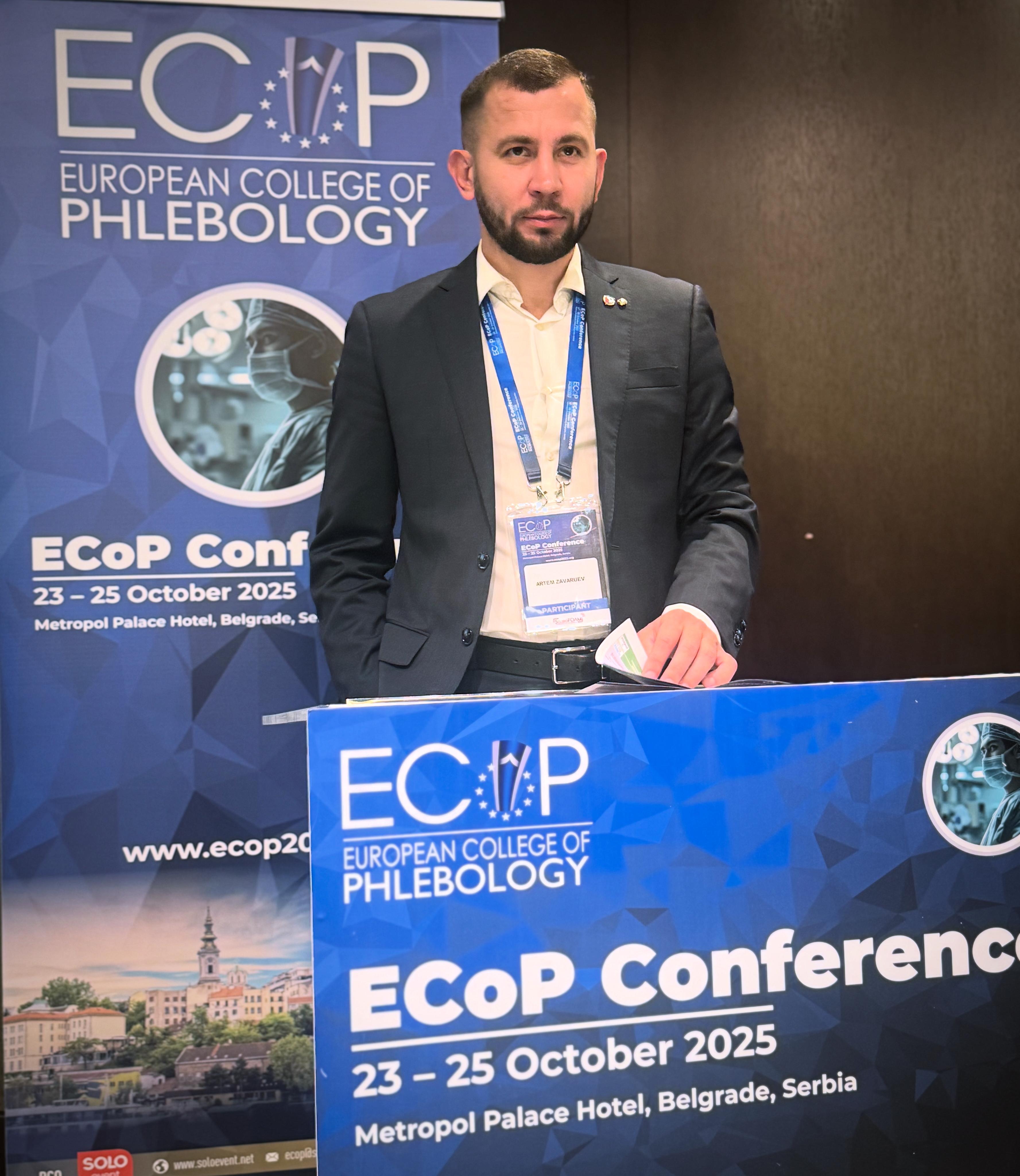 Также Артем Заваруев поучаствовал в Конференции ECoP 2025, организованной Европейским колледжем флебологии. Она проходила с 23 по 25 октября в г.Белград, Сербия. Конференция ECoP 2025 стала площадкой для профессионального роста, обмена передовыми технологиями и новыми открытиями в лечении венозных патологий. Обширная дискуссия и тематическое разнообразие охватили ключевые проблемы современной флебологии, включая вопросы эффективности терапевтических подходов и инновационные методики диагностики и лечения.