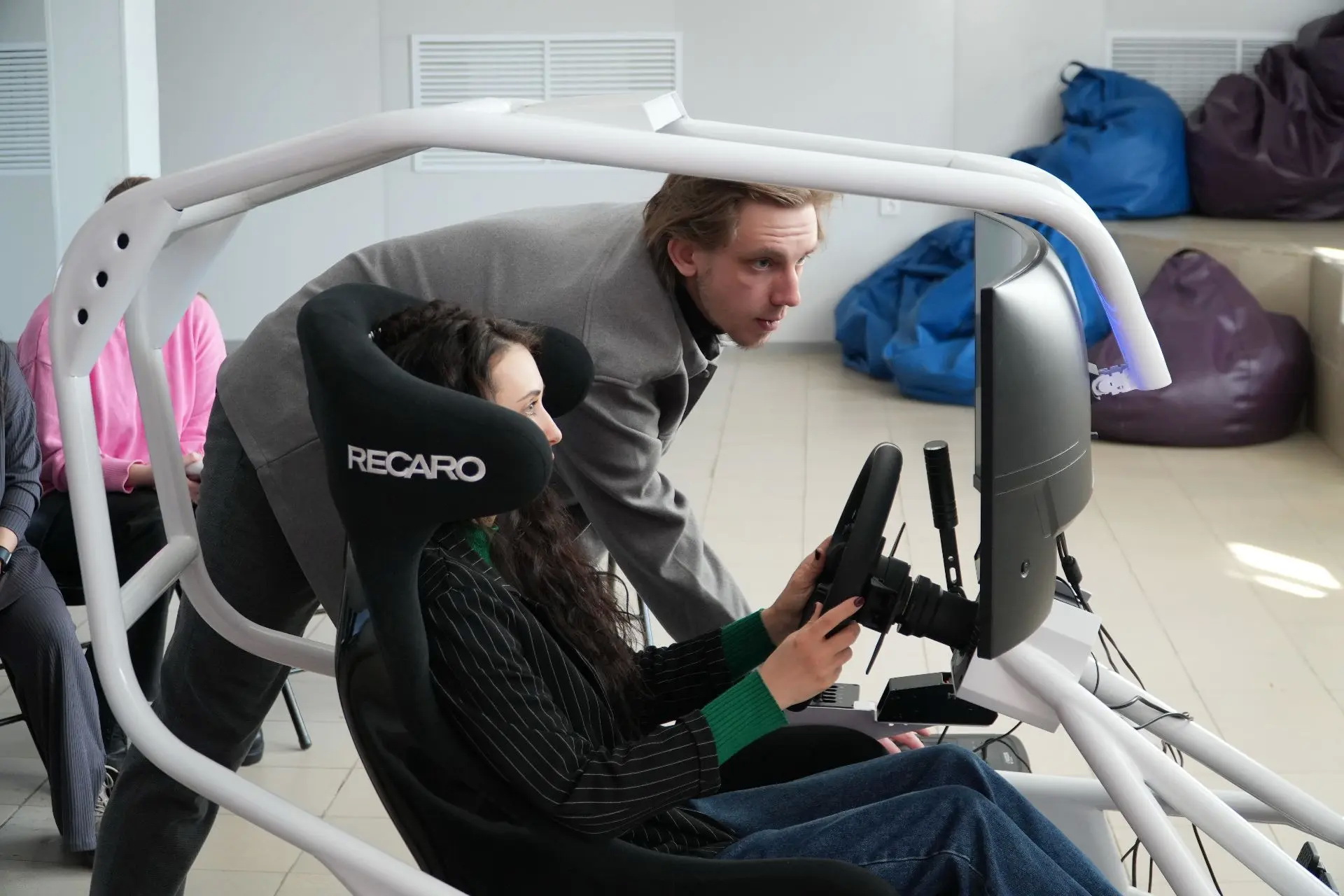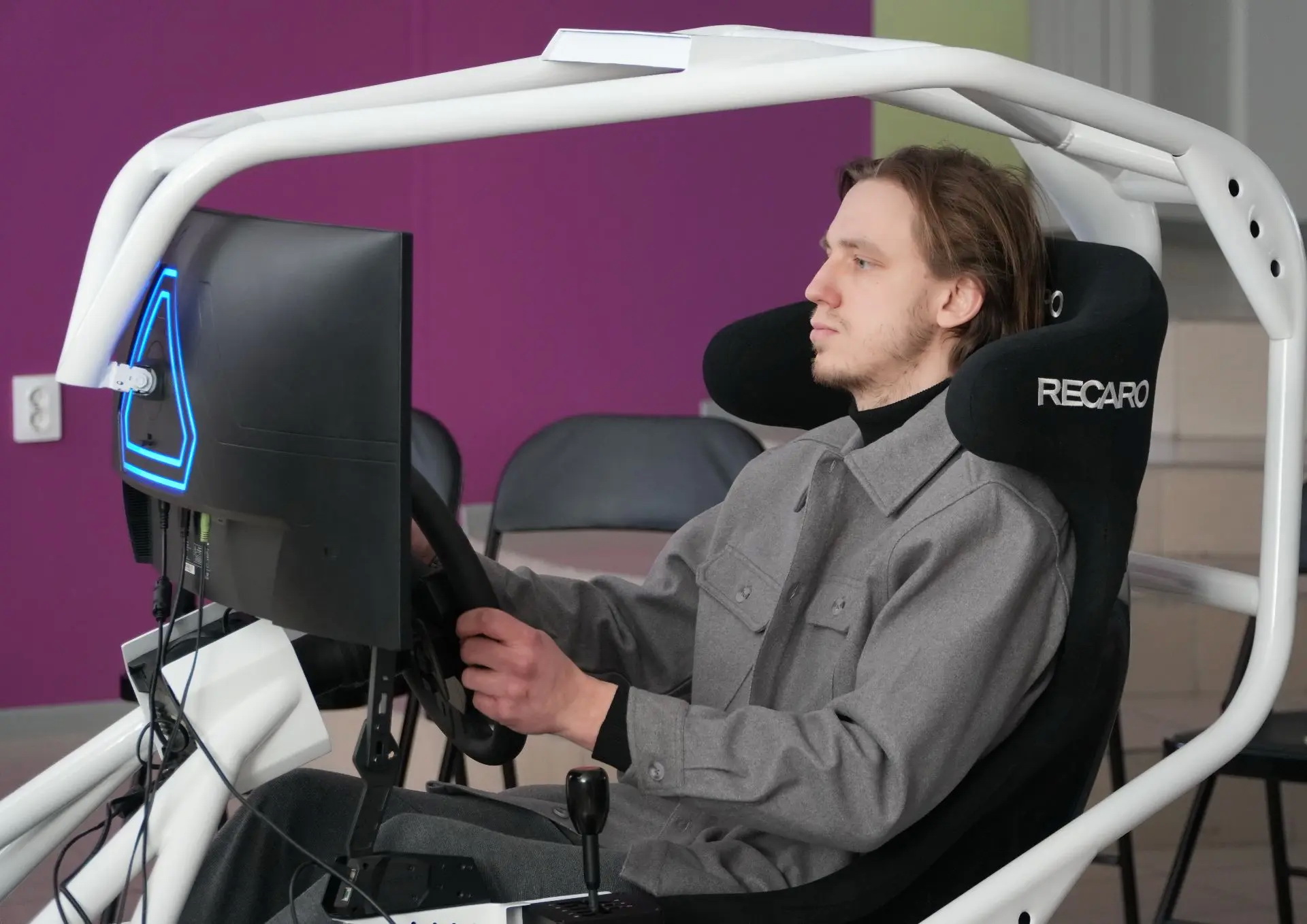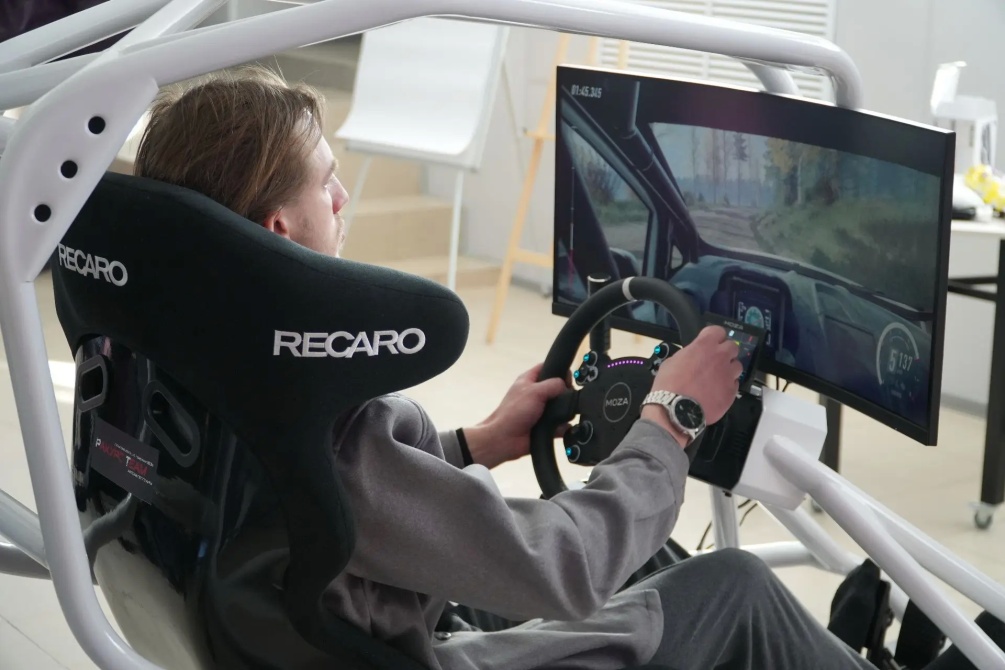 — В медакадемии собралась группа студентов, которые интересуются как медициной, так и техникой. Когда думали — как это всё связать, родилась идея создать свой автоспортивный симулятор. Установка создана с нуля, проектированием занялись с прошлого года. В плане компоновки, дизайна и некоторых технических решений аналогов у нее нет. Одно из технических решений — крепление монитора из-за головы, имитация каркаса безопасности, как в реальном гоночном автомобиле, создается ощущение как будто находишься за рулем. Дополняет картину система обратной связи собственной разработки — она передает данные от телеметрии игры к исполнительным механизмам, благодаря которым пилот ощущает вибрации от работы двигателя, неровностей дороги, прыжков, блокировки или пробуксовки колес, что позволяет вкупе с применением VR технологий вывести эффект погружения на новый уровень. Кроме этого, система обратной связи нивелирует неприятные ощущения при использовании VR шлема, связанные со спецификой работы вестибулярного аппарата, позволяя оператору быстрее адаптироваться к симулятору — пояснил Виталий Алексеевич.