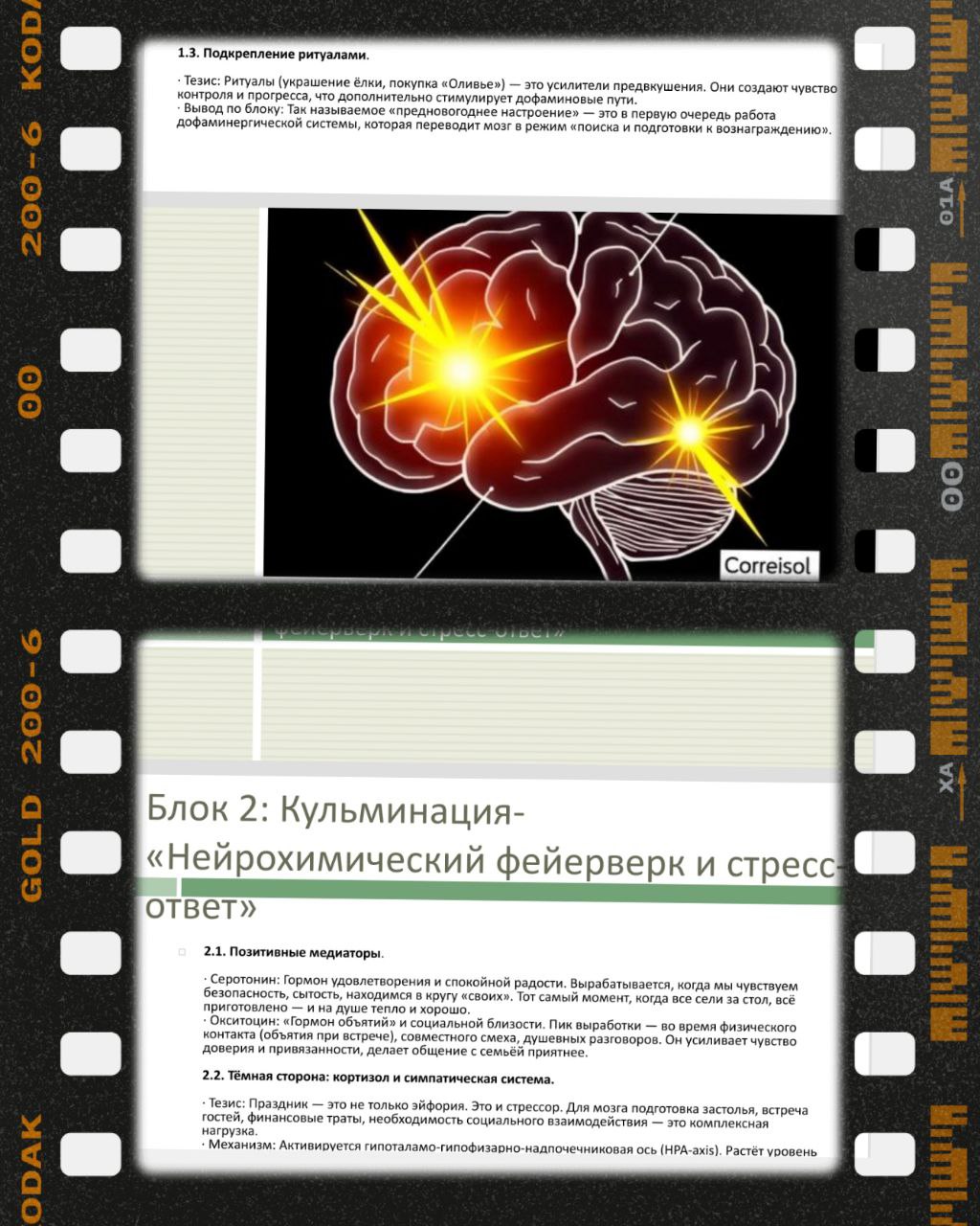 Была подробно раскрыта роль лимбической системы в формировании эмоциональной памяти и ностальгии, где обонятельные и звуковые триггеры (запах мандаринов, новогодние мелодии) напрямую активируют центры эмоций и автобиографической памяти.