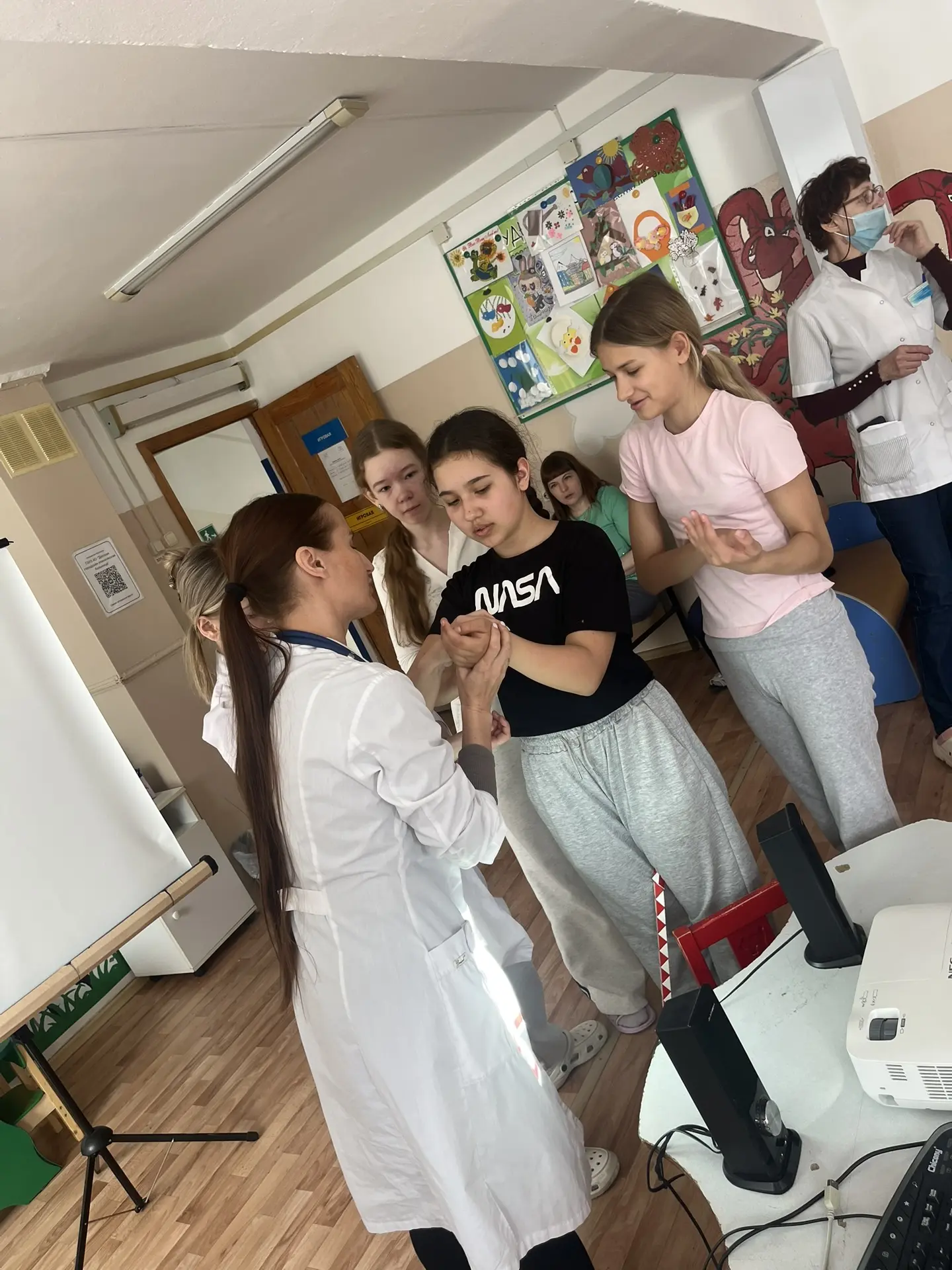 В ходе занятия школьники освоили технику наложения различных видов повязок; основы аускультации — учились слушать тоны сердца и дыхание легких; правила оказания первой помощи при бытовых травмах; азы пеленания и ухода за новорожденными для желающих попробовать себя в педиатрии.