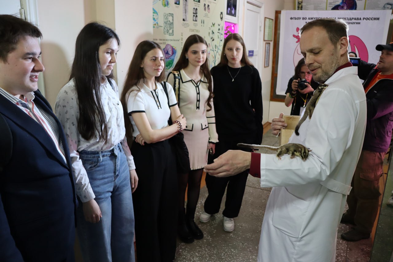 Кафедра биологии удивила школьников обитателями своего живого уголка – белки -летяги, птицы, рыбы, молюски – все это увидели ребята, а еще в микроскоп пытались рассмотреть насекомых и паразитов, которых не видно невооруженным глазом.