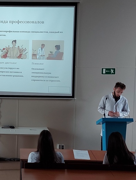 Следующий доклад был представлен Соломиной К.С. и Шириповой Э.А., ординаторами 1 года по специальности «Эндокринология». Они обсудили современные подходы к лечению сахарного диабета 2 типа. Была подчёркнута важность персонифицированного подхода к каждому пациенту, учитывая его возраст, состояние здоровья и образ жизни. В докладе была подчёркнута роль диетотерапии и физической активности в комплексном лечении диабета, а также важность регулярного мониторинга уровня глюкозы в крови. Кондрашин Н.А. и Пермякова А.С., студенты 517 группы, представили доклад о терапевтическом обучении и психологической поддержке больных сахарным диабетом. Обучение пациентов навыкам самоконтроля и управления своим заболеванием является ключевым фактором в успешном лечении. Никита Андреевич и Анастасия Сергеевна также подчеркнули важность психологической поддержки, которая помогает пациентам справляться с эмоциональными трудностями, связанными с болезнью; поделились опытом работы с пациентами и рассказали о том, как важно поддерживать их мотивацию и уверенность в своих силах.