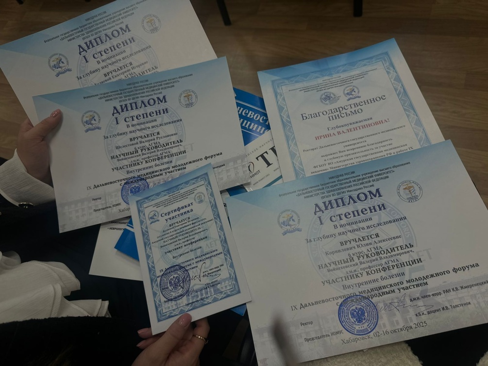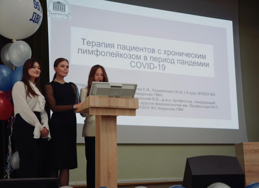 В рамках конгресса прошел Медицинский молодежный форум с международным участием, на котором свои научные работы представили студенты из Хабаровска, Владивостока, Благовещенска, других городов России и стран СНГ. Студентки 6 курса Амурской медакадемии Юлия Корнилович, Екатерина Беляева и Валерия Шелестова получили первое место в номинации «За глубину научного исследования» за работу «Терапия пациентов хроническим лимфолейкозом в период пандемии COVID-19».