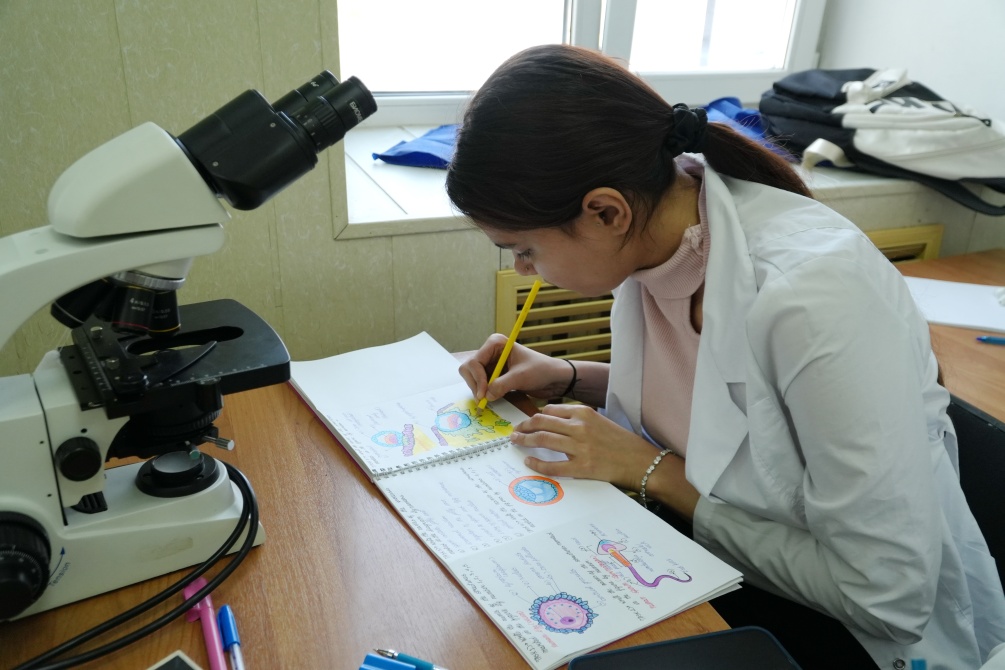 — Ребята приступили к изучению курса гистологии, эмбриологии, цитологии. На изучение этой дисциплины у нас предусмотрено два семестра, по окончании которых студенты сдадут экзамен. Иностранным студентам довольно сложно даётся изучение дисциплины, так как появилось очень много новой терминологии для них. Учитывая языковой барьер, занятия требуют большой подготовки — как со стороны ребят, так и с моей стороны, как преподавателя. Мы первые два занятия изучали клетку, сейчас — эмбриональное развитие человека, чуть позже будем изучать ткани и органы. Гистологию можно назвать микроанатомией, здесь студенты изучают, как устроено тело человека на микроскопическом уровне, — рассказала заведующий кафедрой гистологии и биологии Ирина Юрьевна Саяпина.