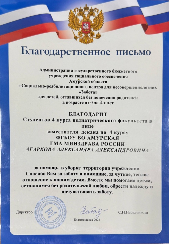 Помимо официальных городских субботников, студенты регулярно посещают ГБУ СО АО «СРЦН Забота», более известный, как «Дом малютки». Уже традиционно, каждую осень будущие детские врачи приезжают и помогают персоналу данного учреждения наводить порядок на территории и проводить генеральную уборку внутри помещения. Педиатрический факультет 4 курса всегда с энтузиазмом принимал такие предложения, а теперь и сами студенты напоминают о своем уже привычном деле: «Когда в этом году мы в Дом малютки поедем?» Руководитель и персонал учреждения всегда радушно принимает наших студентов и сердечно благодарит их, а также руководство курса и администрацию Амурской медакадемии.