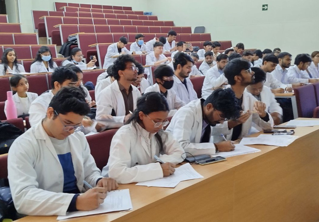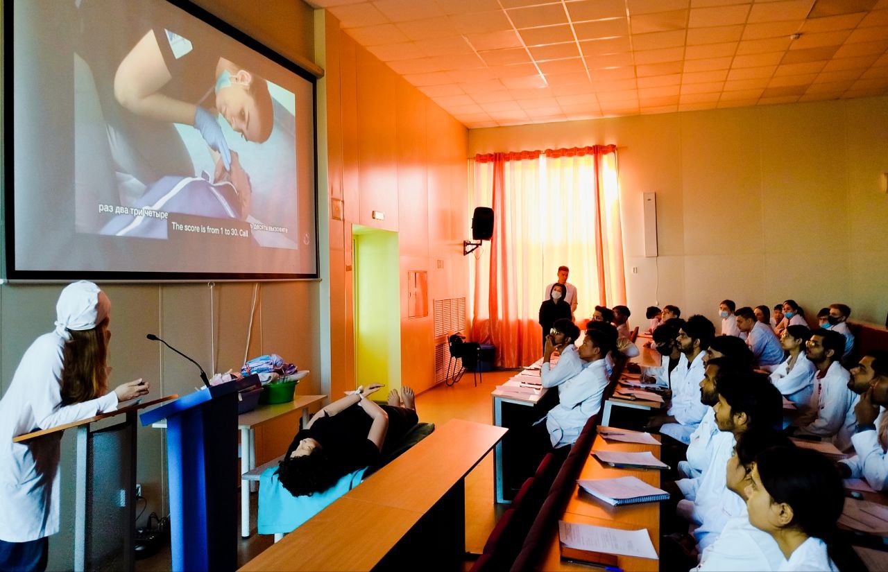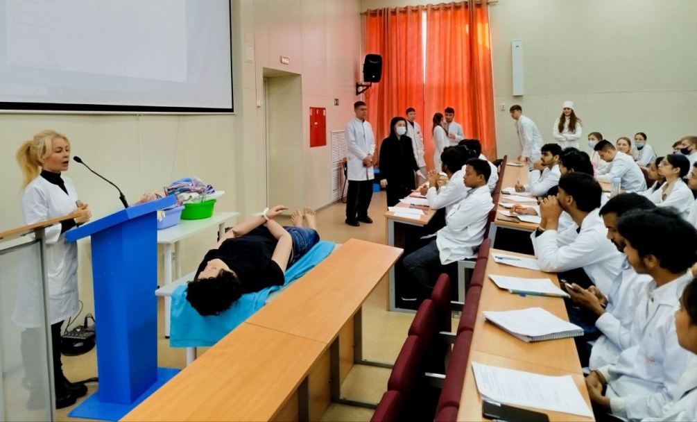 Стартовала учебная практика «Ознакомительная практика — Практика по получению первичных профессиональных умений и навыков. Общий уход за больными терапевтического и хирургического профиля» для студентов первого курса, обучающихся по англоязычной программе «Первые шаги в профессию». Руководителем практики является заведующий кафедрой пропедевтики внутренних болезней, профессор Ираида Георгиевна Меньшикова. Всего в этой группе 46 студентов из Индии и один из Китая.