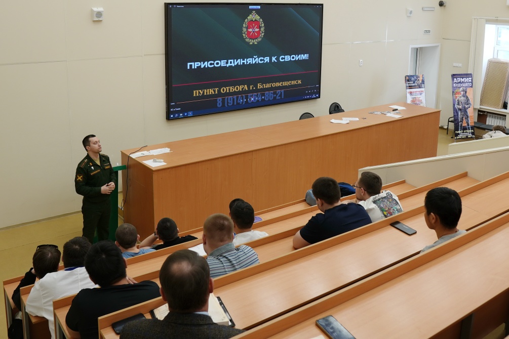 Проректор по безопасности Амурской ГМА Андрей Леонидович Шелевой напомнил собравшимся о том, что для обучающихся Амурской ГМА, в том числе, студентов, находящихся в академическом отпуске, государством предусмотрены особые условия: ребята могут пойти служить в войска по контракту. Общий срок службы в ВБС РФ составляет 12 месяцев, из них два месяца обучение и 10 месяцев службы.