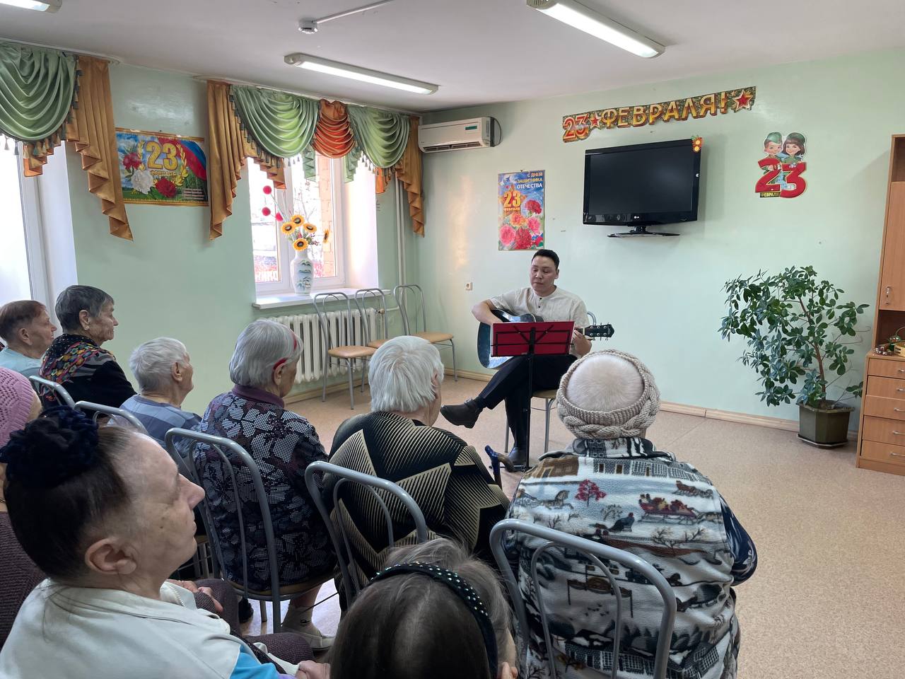 Студент шестого курса Амурской ГМА Виктор Шестаков исполнил под гитару любимые песни старшего поколения. А руководство дома ветеранов наградило студентов медакадемии благодарственным письмом за участие в праздничном концерте ко Дню защитника Отечества.