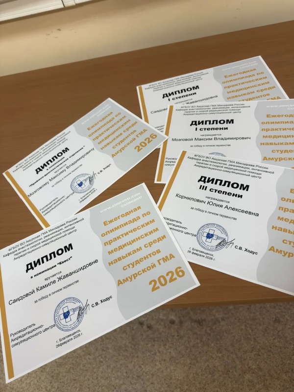 Для представления Амурской ГМА на Всероссийской олимпиаде, которая пройдет с 15 по 17 апреля 2026 года, приглашены Саидова Камила Жаваншидовна, Мозговой Максим Владимирович, Переверзев Илья Александрович, Корнилович Юлия Алексеевна, Тен Данила Сергеевич.