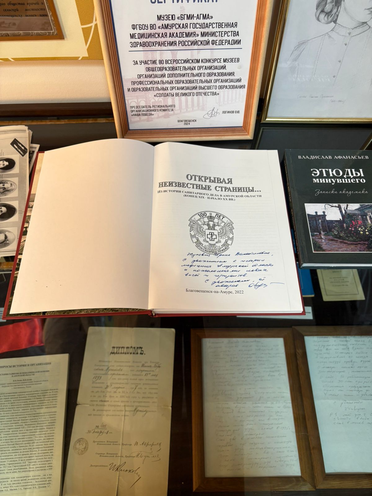 Так в новых поступлениях - книги по истории медицины, номера газеты «Амурская медицина» с авторской подписью, альбом об открытии музея академии в 2012 году.