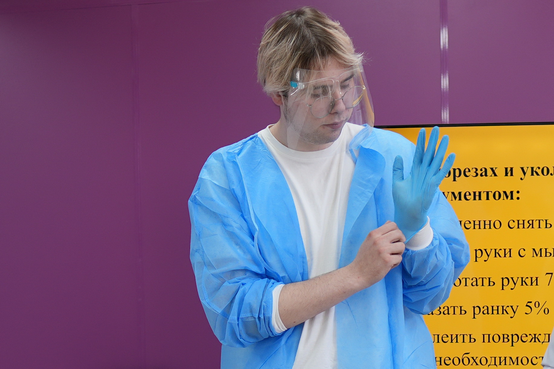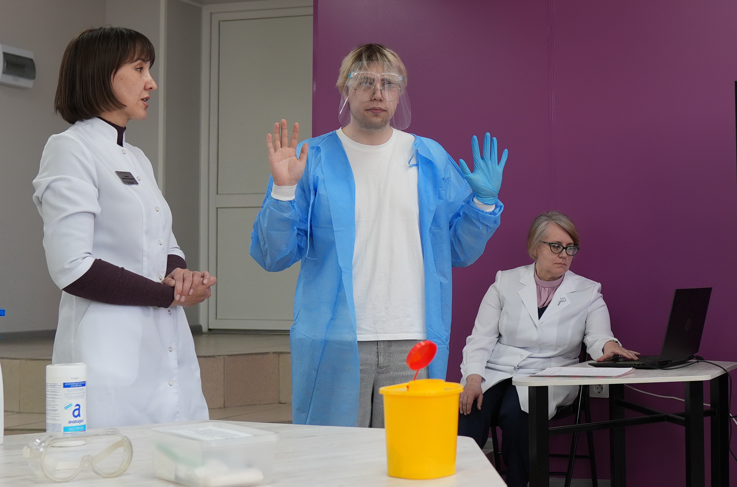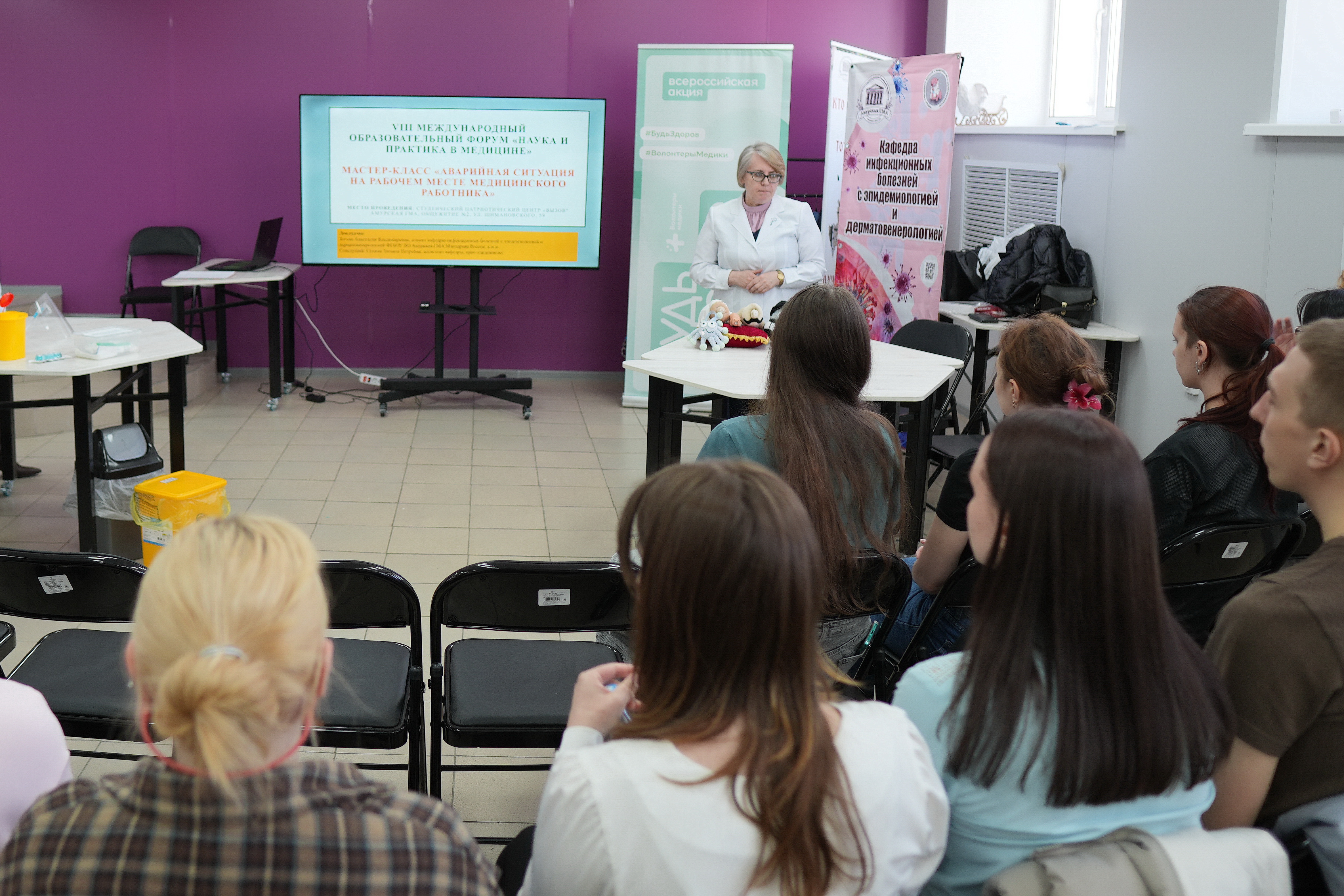 Занятие для студентов провела эпидемиолог Амурской областной инфекционной больницы, ассистент кафедры инфекционных болезней с эпидемиологией и дерматовенерологией Татьяна Петровна Сухина. Приглашённым актёром, изобразившим пострадавшего медика на рабочем месте, выступил студент первого курса Влад Проскурин.