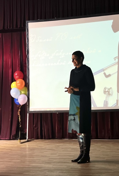 С поздравительным словом на концерте, посвящённым 70-летнему юбилею, выступила исполняющая обязанности ректора, д.м.н. Ирина Валентиновна Жуковец, отметившая высокий профессионализм сотрудников кафедры и вдохновившая на достижение новых профессиональных и творческих высот. С тёплыми словами выступили главный врач городской поликлиники №4, к.м.н. Марина Павловна Гулевич и главный врач Благовещенской городской клинической больницы Александр Анатольевич Сучков. Поздравить сотрудников кафедры пришли гости и добрые друзья кафедры: коллектив кафедры пропедевтики внутренних болезней во главе с д.м.н., профессором Ираидой Георгиевной Меньшиковой, заведующий кафедрой госпитальной терапии с курсом фармакологии имени профессора Ю.С. Ландышева, д.м.н., профессор Валерий Владимирович Войцеховский. С юбилеем кафедру поздравили коллеги и выпускники и со всех уголков страны: руководитель отдела медицинских советников фармацевтической компании GSK, к.м.н. Алексей Александрович Ермолаев, д.м.н., профессор, заслуженный деятель науки ХМАО-Югры Марина Алексеевна Попова, д.м.н., профессор СВФУ им .М.К. Аммосова Вадим Григорьевич Кривошапкин, заместитель директора по лечебной работе ДНЦ ФПД, к.м.н. Екатерина Юрьевна Кочегарова и многие другие. С поздравительным концертом на празднике выступили студенты 4 курса Амурской медицинской академии.